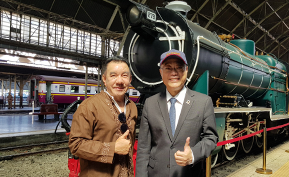 台泰鐵道交流。周永暉理事長率團赴泰國國際旅展推廣台灣觀光,並參訪泰國最古老車站曼谷「華藍蓬車站」,與泰國鐵道基金會交流,分享推動鐵道觀光經驗。