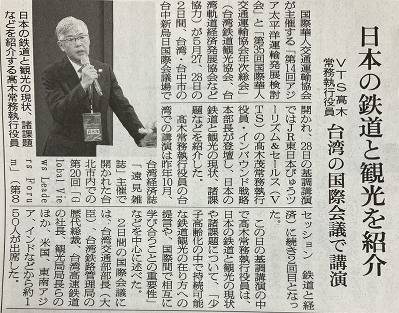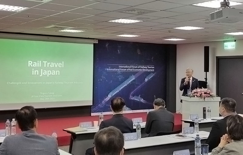 本次鐵道觀光國際論壇,特別邀請了日本、印度、台灣等三地的鐵道旅遊專家進行專題演講。 第一場專題講者是JR東日本 高木 茂執行董事,題目:Rail Travel in Japan-Challenges and Innovations in Japan’s Railway Tourism Industry,分享日本發展鐵道旅遊150年的經歷、民營化的轉變實現鐵道運輸外多元化的發展、COVID-19帶來的挑戰及重建與創新的機會。高木先生在返國後也與日本媒體分享了這次參與論壇的心得並感謝本協會的邀請。