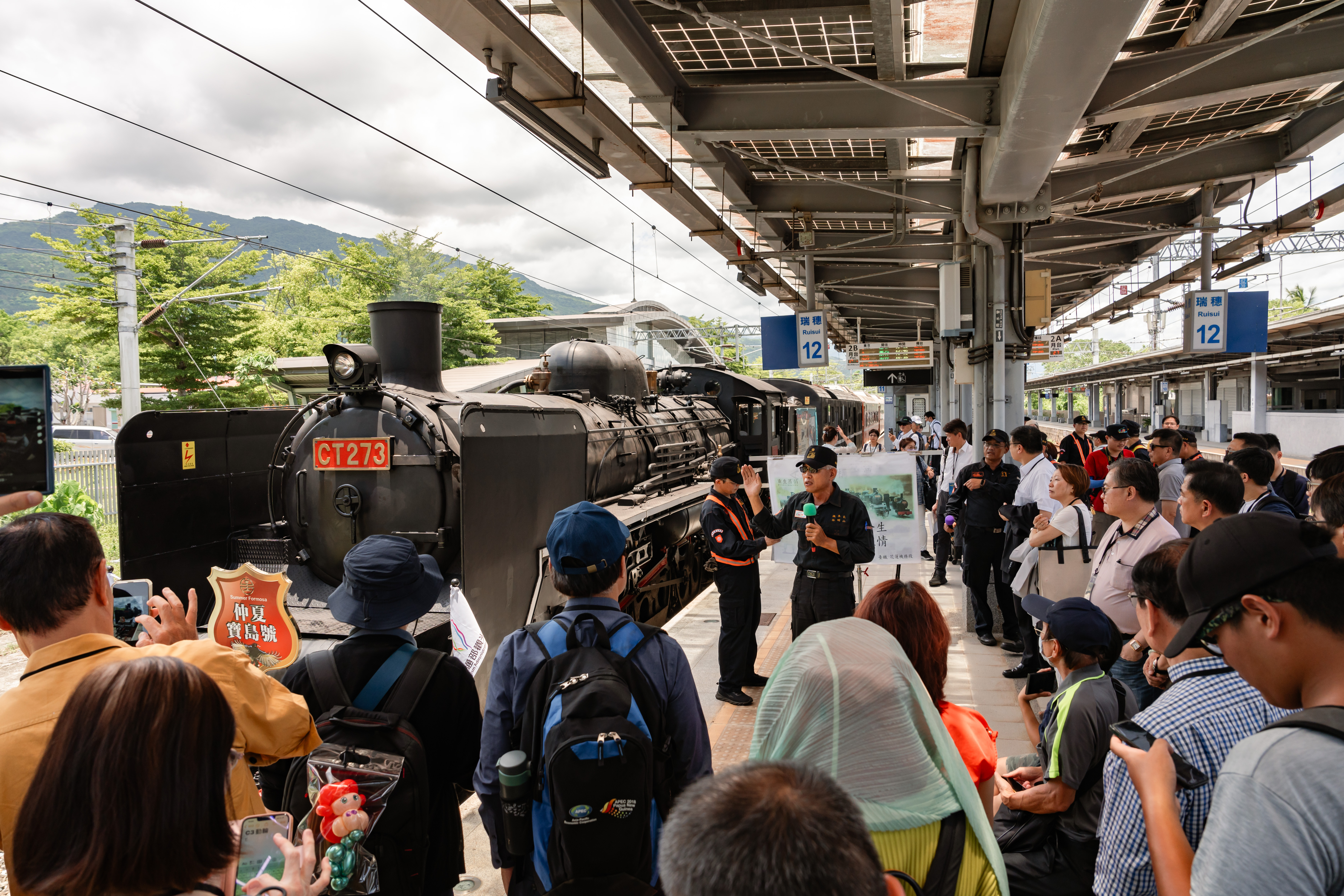 列車抵達玉里後,一位嬌客已駐足在月台歡迎大家,原來是台鐵為了翌日2024仲夏寶島號啟航活動正在暖身的蒸氣女王- CT-273蒸汽機車,這份驚喜讓所有旅客驚呼連連,也是鐵道旅遊的魅力之一。
