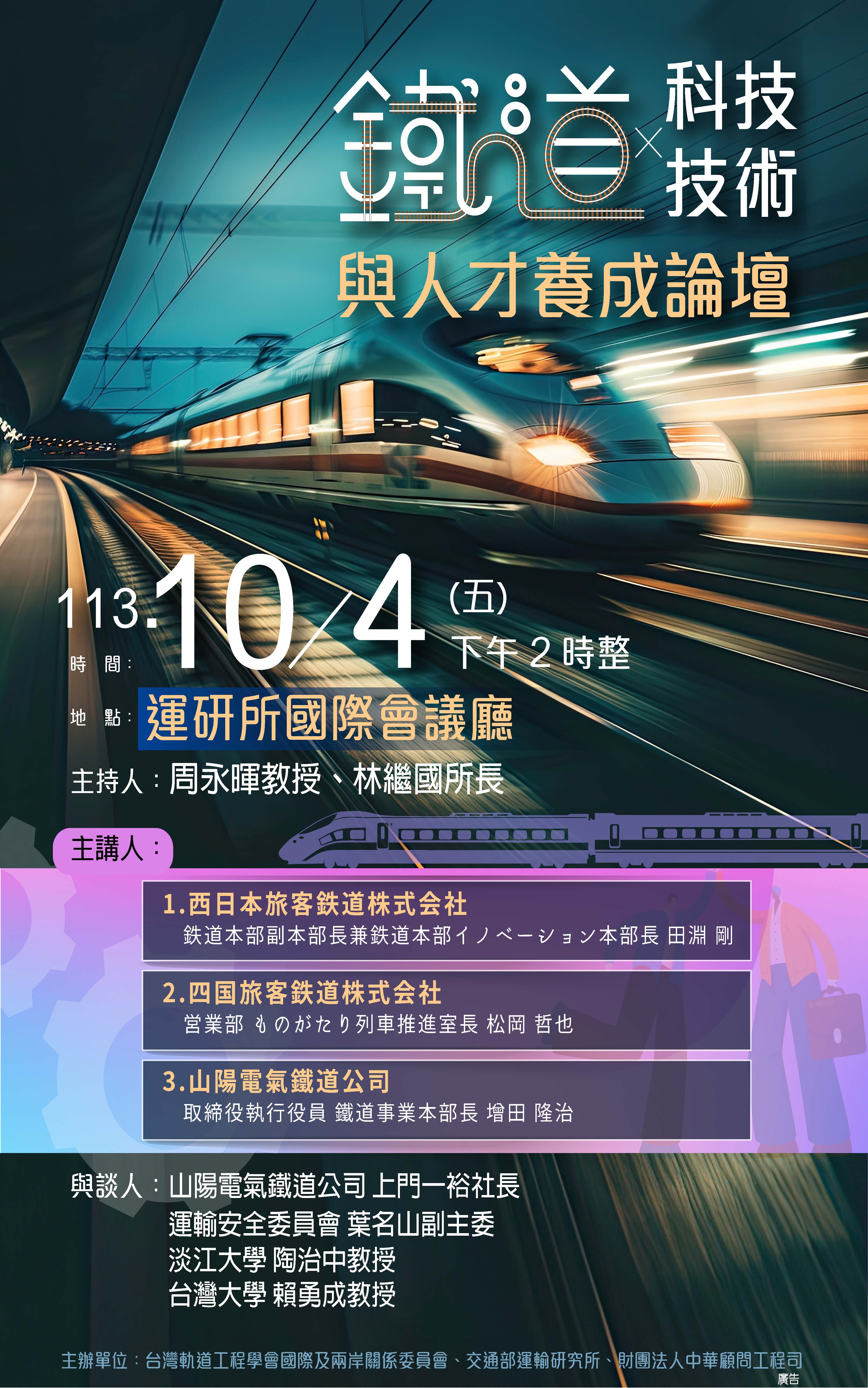 台灣軌道工程學會訂於113年10月4日下午2時整,假交通部運輸研究所B1國際會議廳舉辦「2024國際鐵道科技與人才養成論壇」,請踴躍參與,以利國際技術交流與鐵道人才培訓養成之推動。