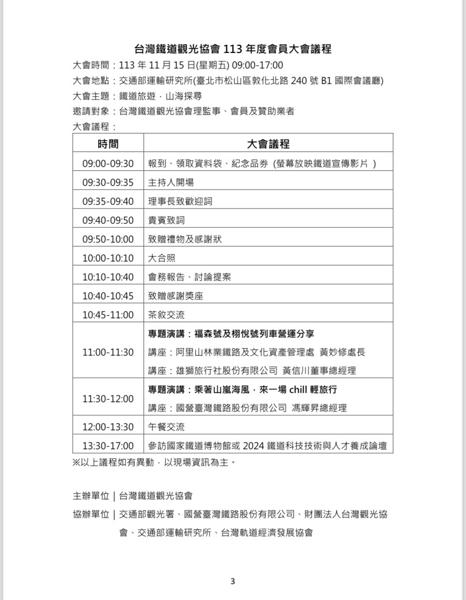 台灣鐵道觀光協會113年度會員大會15日舉辦,邀請您參加!