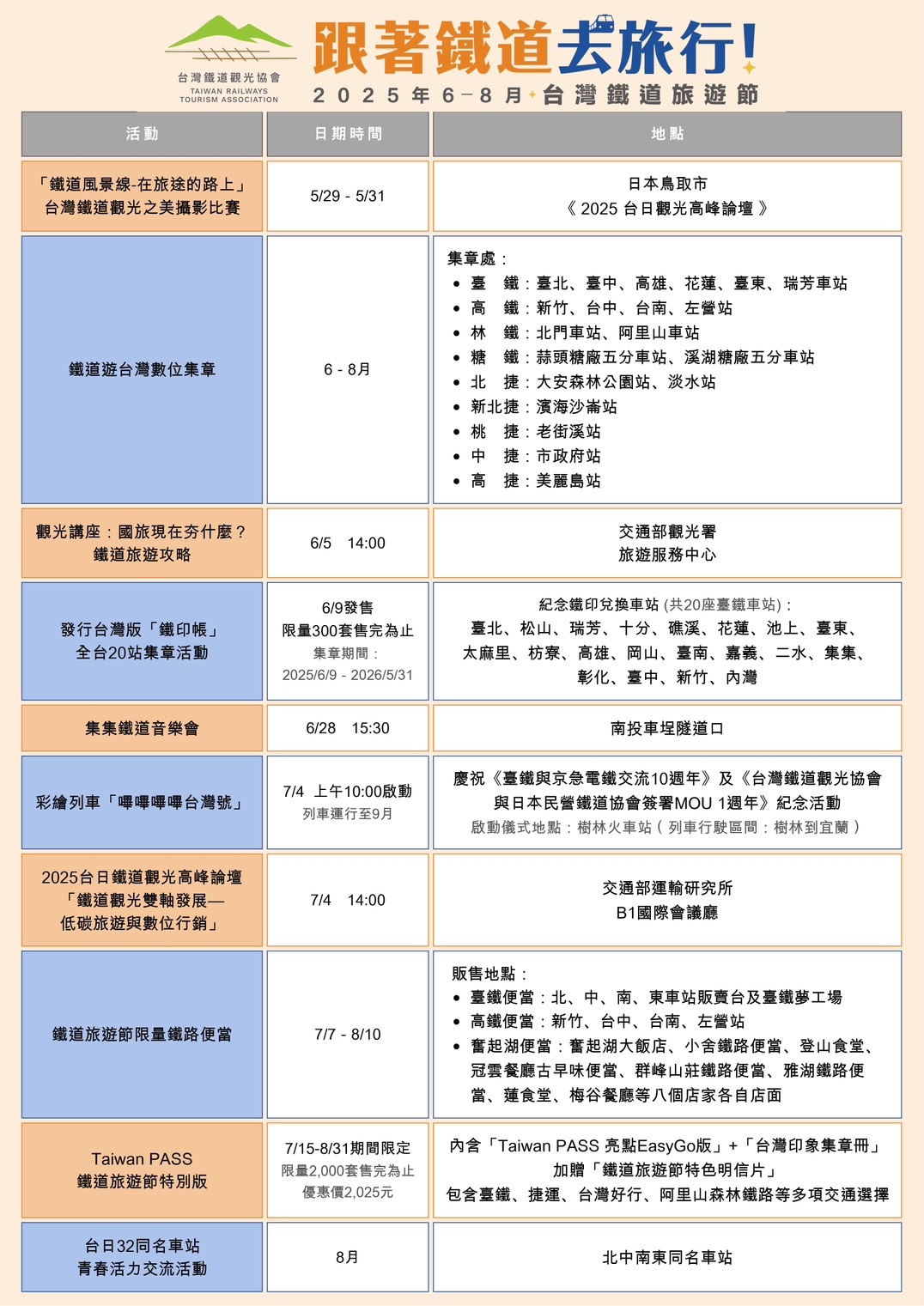 與日本交流的活動有:5月29日在日本鳥取辦理台灣鐵道觀光之美攝影展;6月9日台日同時發售台灣版「鐵印帳」;在日獲得東京屋外廣告競賽會長獎的「嗶嗶嗶嗶台灣號」觀光列車,原汁原味回台運行,將於7月4日上午在樹林火車站啟動;同日下午台日鐵道觀光高峰論壇,由台灣鐵道觀光協會與日本民營鐵道協會雙方鐵道旅遊專家,分享台日觀光鐵道的永續發展與數位經營;8月份邀請日本鐵道迷來台與台方青年共同在北中南東選擇台日32同名車站創新規劃鐵道旅遊行程。