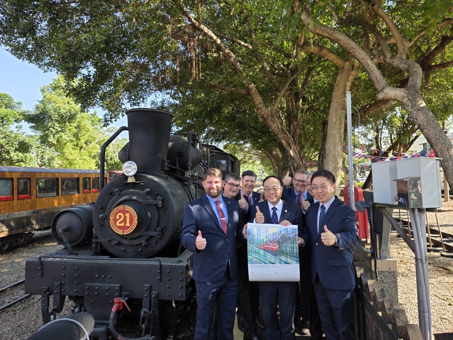 阿里山林業鐵路與澳洲之字形鐵路,都是以「之」字形路線聞名的百年鐵道,今(12/9)日在嘉義締結姊妹鐵路,台灣鐵道觀光協會周永暉理事長與黃信川、蕭冠群、黃怡平等理事一同蒞臨慶賀,更對主辦方農業部林業署林華慶署長、也是本協會的常務理事,以及阿里山林鐵及文資處王昭堡處長、也是本協會的監事,表達他們對台灣鐵路觀光與國際交流貢獻的感佩,期盼借重澳洲鐵路團隊擅於蒸汽機車修復,明(115)年讓蒸汽火車21號重駛山地線。